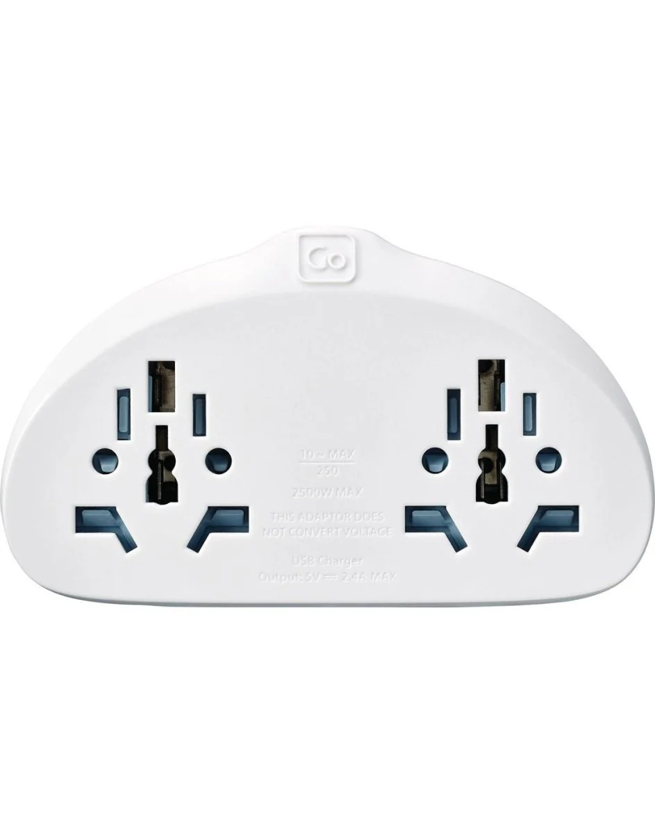 Short on sockets or simply don’t have space for multiple chargers and adaptors? This universal, grounded adaptor makes an essential companion for powering multiple devices from a single socket for travellers from 100s of destinations. The 2 USB ports have a 2.4A auto-regulating power output when dual charging. Perfect for quickly and efficiently charging two power-hungry USB devices such as tablets, simultaneously. The adaptor fully complies with the latest safety standards, protecting you and your devices. Not suitable for use with Schuko devices.