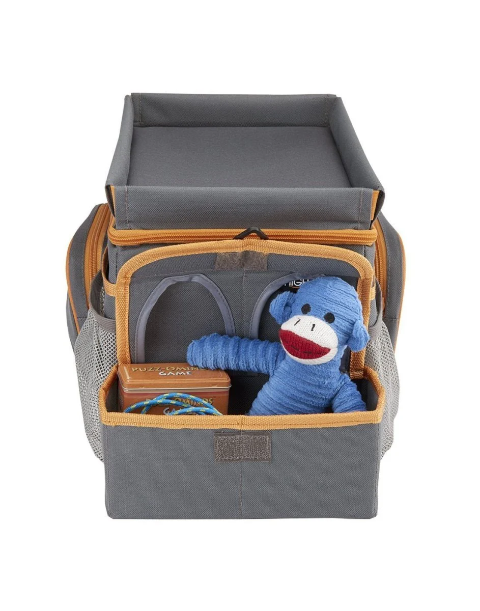 Give kids their very own back seat entertainment organizer, complete with 2 cup holders, an eating or play tray, an insulated cooler and 8 storage pockets. Perfect for cross-country road trips, cross-town commutes, a picnic in the park or day at the beach. Its compact 16" long and 8" wide size makes it perfectly portable and a good fit in all vehicles. Toys and accessories not included.